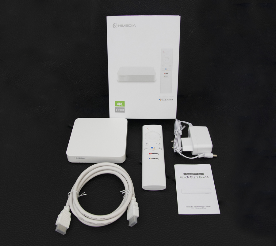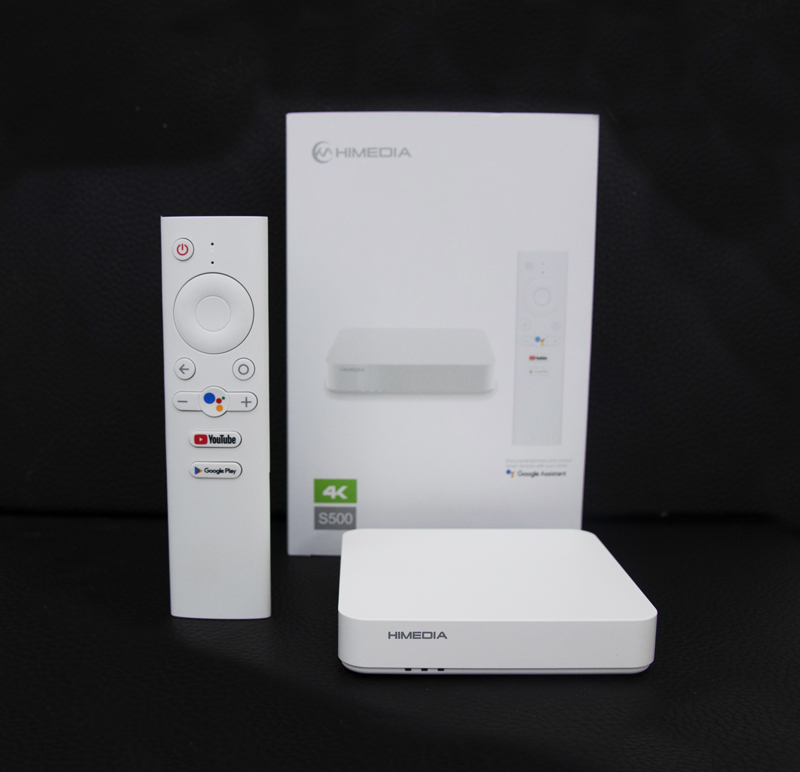 HIMEDIA S500 ấn tượng với toàn bộ thiết bị từ hộp, phụ kiện, box, remote theo máy tất cả đều một tông màu trắng sang trọng, thời trang. Chiếc vỏ hộp màu trắng khá đơn giản nhưng đầy đủ các thông tin liên quan đến bản quyền (license) về các ứng dụng Chrome Cast, Google Assistant, chuân wifi AC, thông tin về hệ điều hành AndroidTv bản quyền.