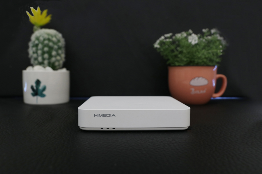 HIMEDIA S500 được thiết kế vỏ nhựa abs chắc chắn màu trắng sữa, cầm khá đầm tay. Ấn tượng về phần mặt trước thiết kế có 3 đèn tín hiệu thể hiện tình trạng kết nối của đầu box. Nếu box kết nối wifi đèn da cam sáng, kết nối bluetooth đèn xanh dương sáng, khi nhận tìn hiệu remote thì đèn đỏ sáng nhấp nháy.