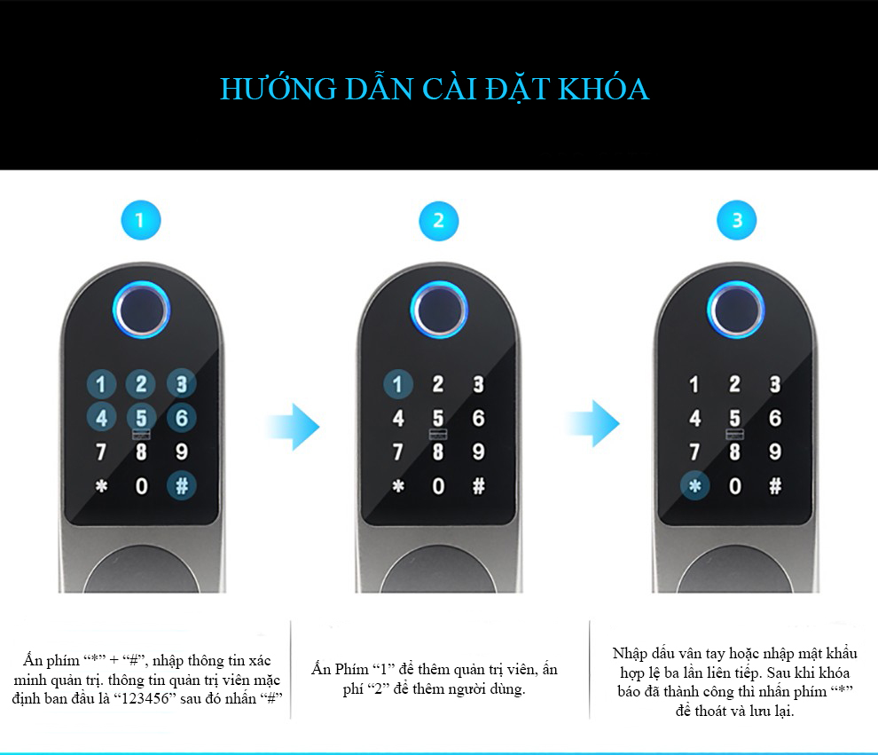 - Có 6 chế độ mở cửa: vân tay, mật mã, thẻ từ, chìa khóa cơ, điều khiển từ xa, mở khóa thông qua APP di động.