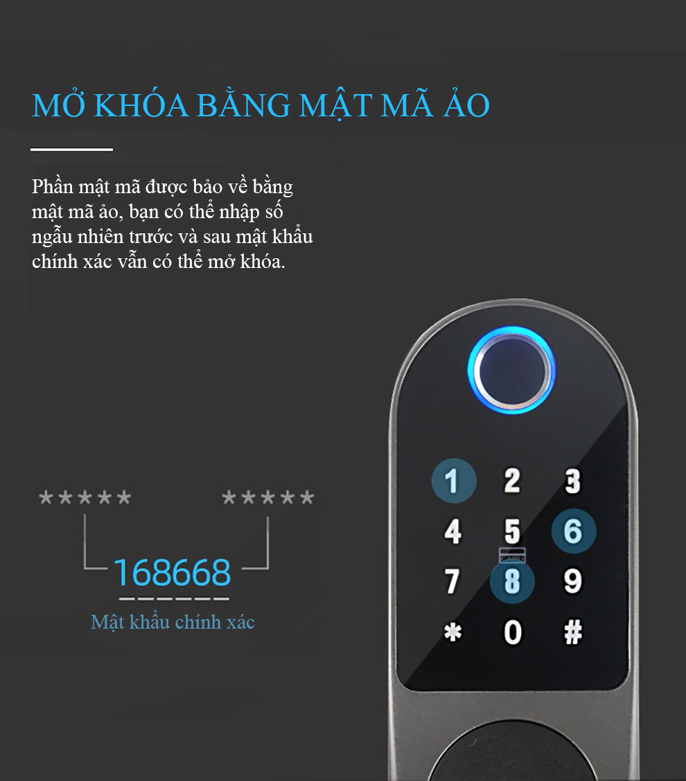 - Công nghệ Mã Số Ảo: cho phép nhập thêm các số trước và sau mã số chống lộ mật khẩu ngay cả khi bị nhìn trực tiếp
